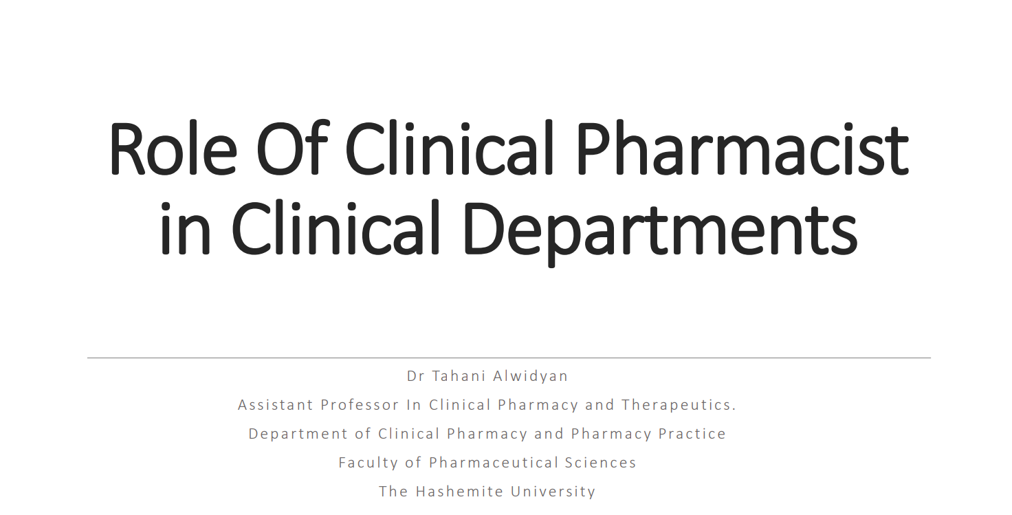 توفر هذه المادة للطلاب المعرفة والفهم لمسؤوليات الصيدلي في المستشفى. تناقش المادة عدة مواضيع مرتبطة بممارسة الصيدلة في المستشفيات بهدف ضمان تقديم رعاية صحية مناسبة وكافية للمرضى ودعم الكوادر الصحية. كما تركز على تطوير وتعزيز مهارات التواصل الفعّال لدى الطالب مع جميع الأطراف المشاركة في ممارسة الصيدلة بالمستشفى.
